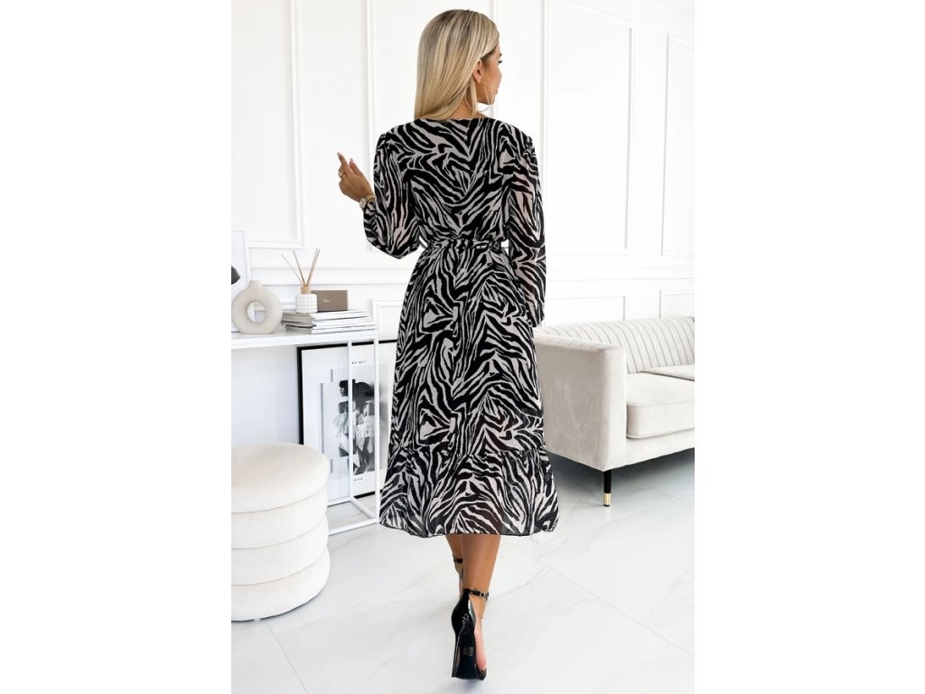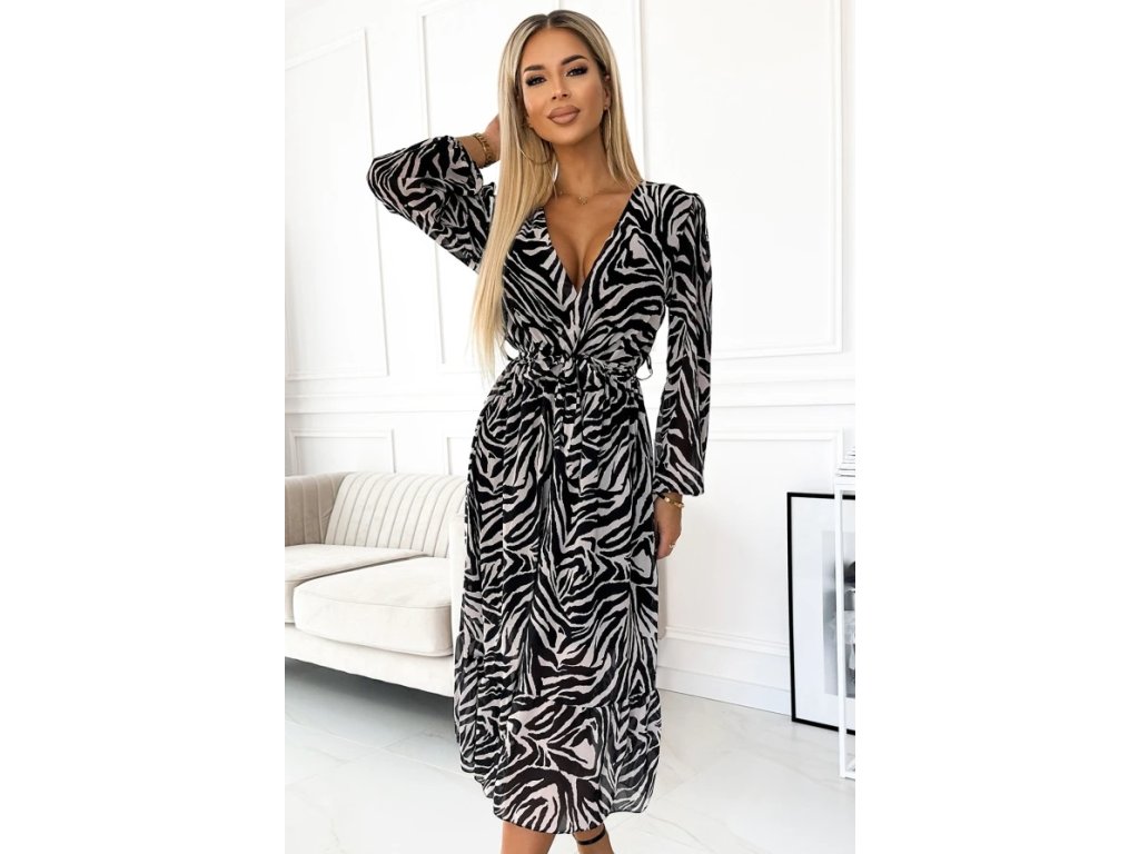 Šifonové šaty s volánky, výstřihem, dlouhými rukávy a páskem.